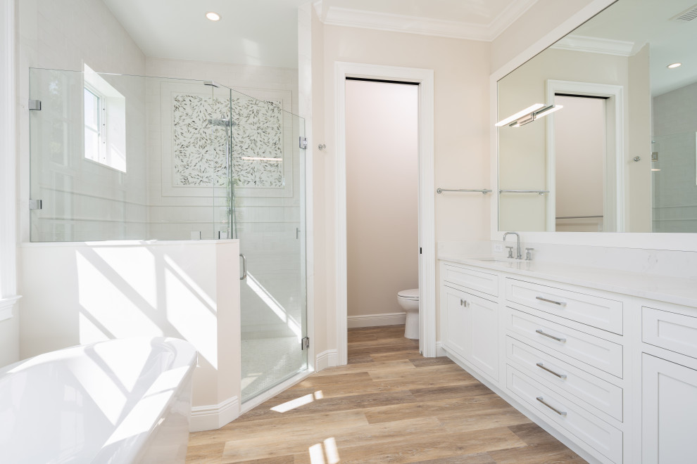 Bathroom Design Vero Beach. Master Bath Remodel with Herringbone Marble Floor. With stainless steel details and a glass staircase, what's not to love about this stunning modern home design.
